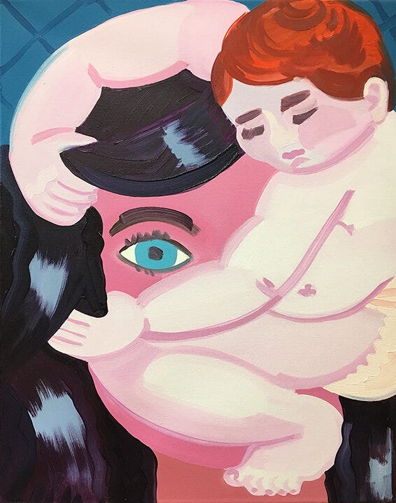 One of the first paintings I did in this series of work is called Cyclops. It’s a 16x20-inch painting of a mother where the baby is wrapped around her head, covering up her face, except for one eye. I think about that painting all the time. I wish I could re-experience making it. I remember painting it quickly in an afternoon, and loving it, loving the colors of it. The way I was working then is I would have the drawing, I’d go to my studio, I’d paint it in a couple hours and then I was done with it. The next day, I’d do something different, so it was super fresh. The simplicity of this one painting has connected to so many others. A lot of the work has the repetition of this one eye. I really love that as a symbol, relating it to mythology, relating it to the evil eye, connecting it to Egyptian hieroglyphic eyes… all the symbolism that can go into it is just endless, like a well of fun to think about making work from.