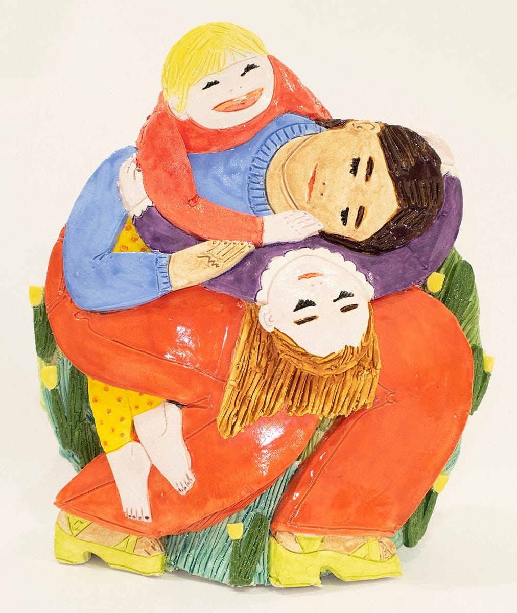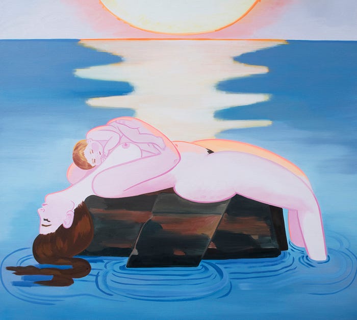 I feel like this is work I’ve been making my whole life. I went to an arts high school and started painting there. The first real painting I made, when I was 14, was a portrait of my mom holding me. It was a 6x4-foot painting. I ended up doing a lot of portraits of people in my family: I painted my mom pregnant, I painted my dad holding me as a baby. There was something healing about it, showing people these portraits. There was a lot of love in it. [Over time, I became] bored with religious imagery of mother and child, and bored with portraiture of seated figures and passive women. When I started grad school, I had just had a baby and I was secretly making work about motherhood and hiding it in my studio. People I was working with found it and were like, “This is really genuine. This is the stuff that’s way more interesting.” I had really great people around me to help me get rid of the artifice around making work. This is the work that came out of that exercise in opening myself up to being vulnerable. Because I’ve been in the depths of babies and little kids for the past few years, it’s just been really natural.