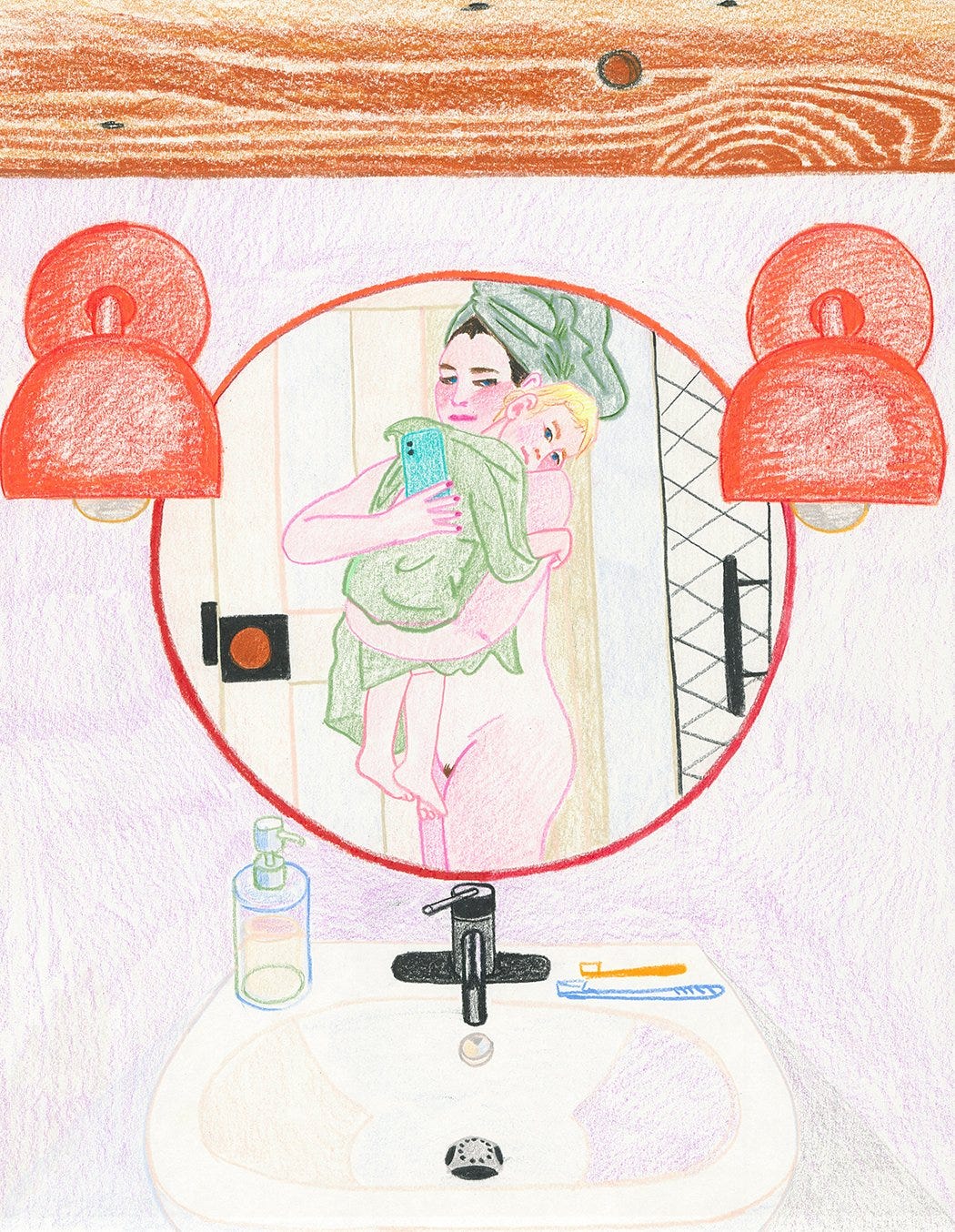 Anything I feel bad about, I think about in my work. Like bath time. A bath is never just a bath. For me, bath is two kids who have to not drown in the tub, who hopefully won’t fight the whole time, and maybe someone can get their butt cleaned. Every moment has so much anxiety built into it—and also so much joy. And then you sit down to supervise, and you really just want to sit on your phone and look at whatever’s happening in the world. It’s also a time where you kind of feel like you get to connect to the outside world.